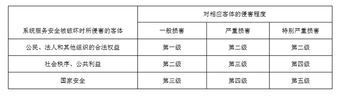 根據系統(tǒng)服務安全被破壞時所侵害的客體以及對相應客體的侵害程度,依據下表即可得到系統(tǒng)服務安全保護等級: