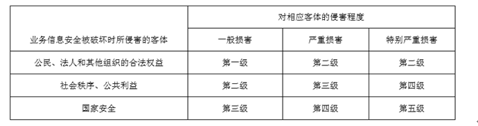 根據業(yè)務信息安全被破壞時所侵害的客體以及對相應客體的侵害程度,依據下表即可得到業(yè)務信息安全保護等級: