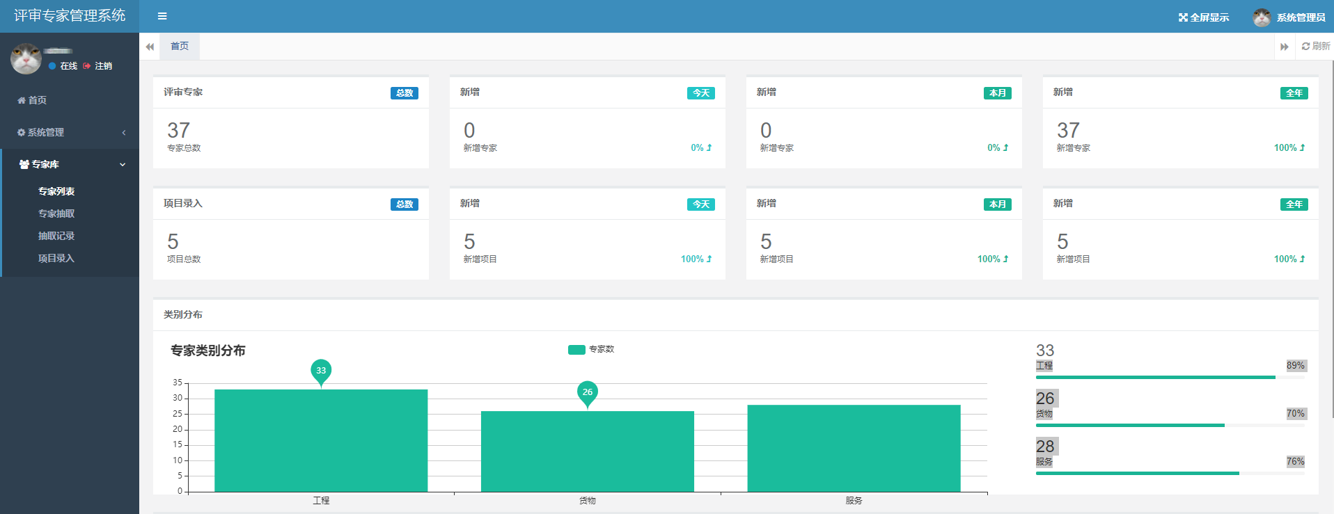 6、數(shù)據(jù)統(tǒng)計:項目數(shù)量統(tǒng)計、專家抽取次數(shù)統(tǒng)計(按專家類別、區(qū)域、內外分別統(tǒng)計)。