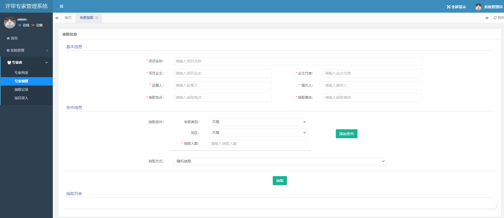 3、評審專家抽取:根據(jù)預設規(guī)則進行抽取、可多次抽取、抽取結束形成記錄、可打?。ɑ蛳螺d)抽取結果(抽取規(guī)則:指定專家類型、地區(qū)、內外部、及各自數(shù)量)。